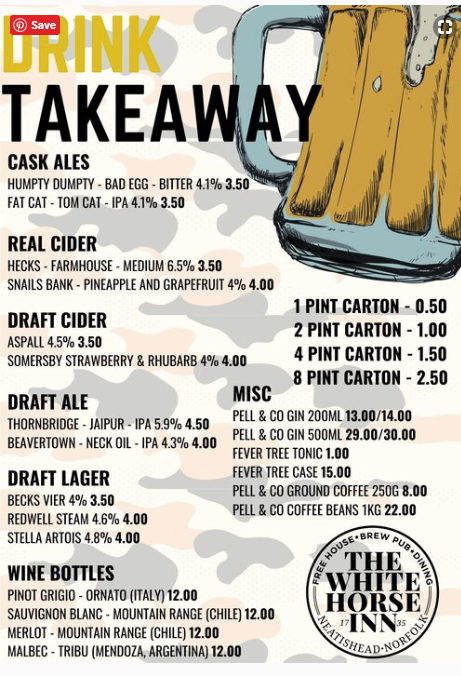 The White Horse at Chedgrave is open for business from the 12th April. Pie Night looks pretty good to me, and it’s available as a takeaway too.